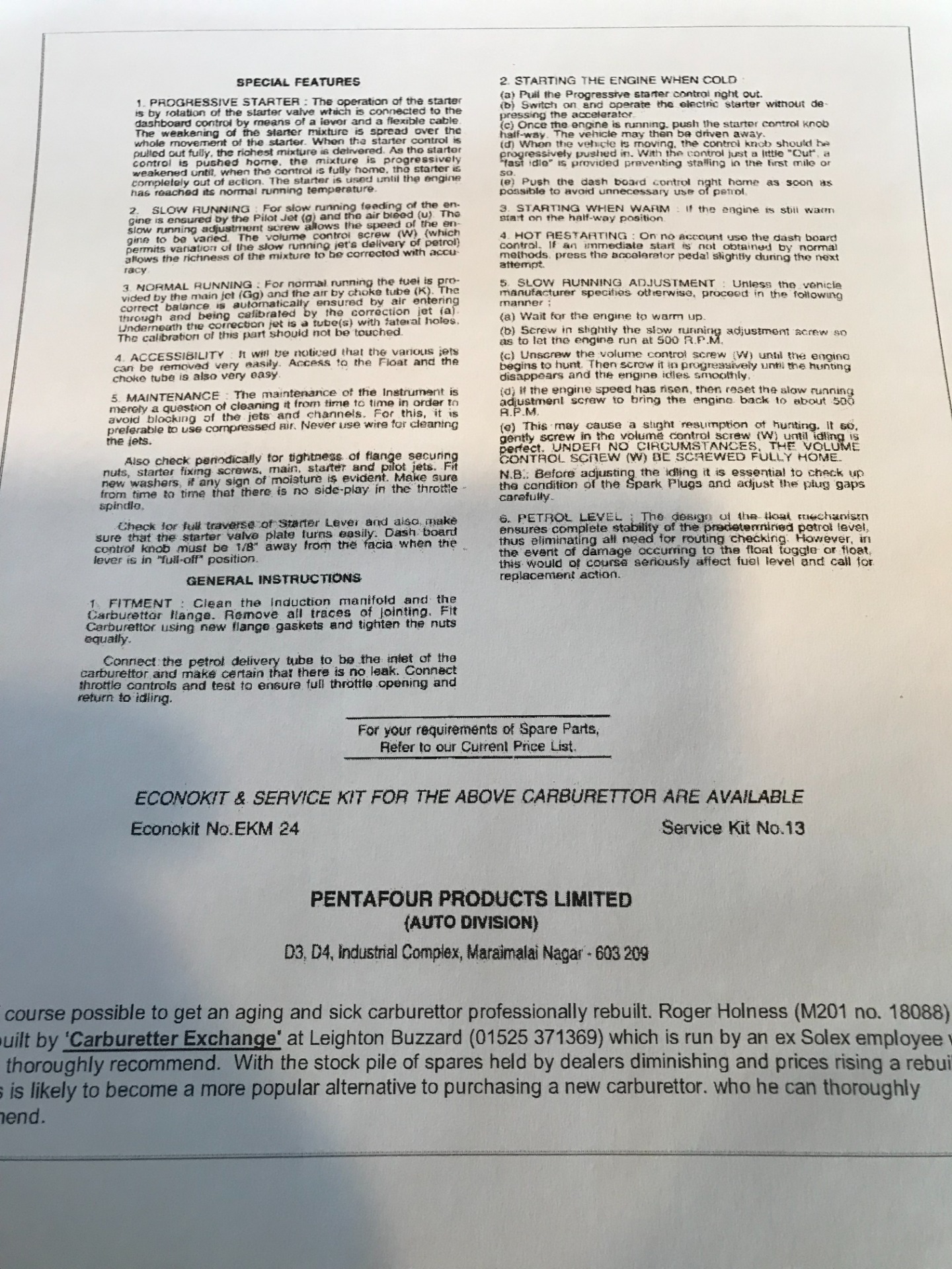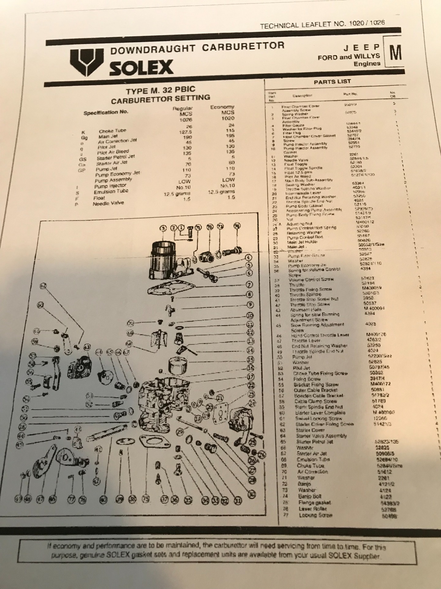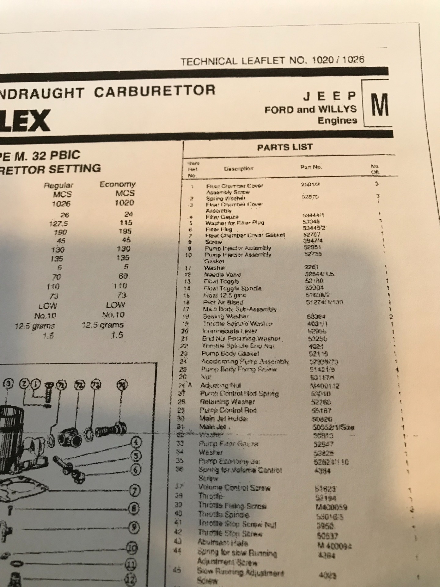 Korrekte Spesifikasjonene fra den Franske hæren for korrekt ytelse for Willys MB/ GPW, CJ2A og CJ3A. Leveres med instruksjoner, 1 stk pakninger. Passer til alle L-head motorer. NB! Når du starter motoren med choke, er det viktig at du ikke trykker på gasspedalen. Å trykke på gassen vil overstyre choken og gi inntrykk av at forgasseren ikke fungerer som den skal.