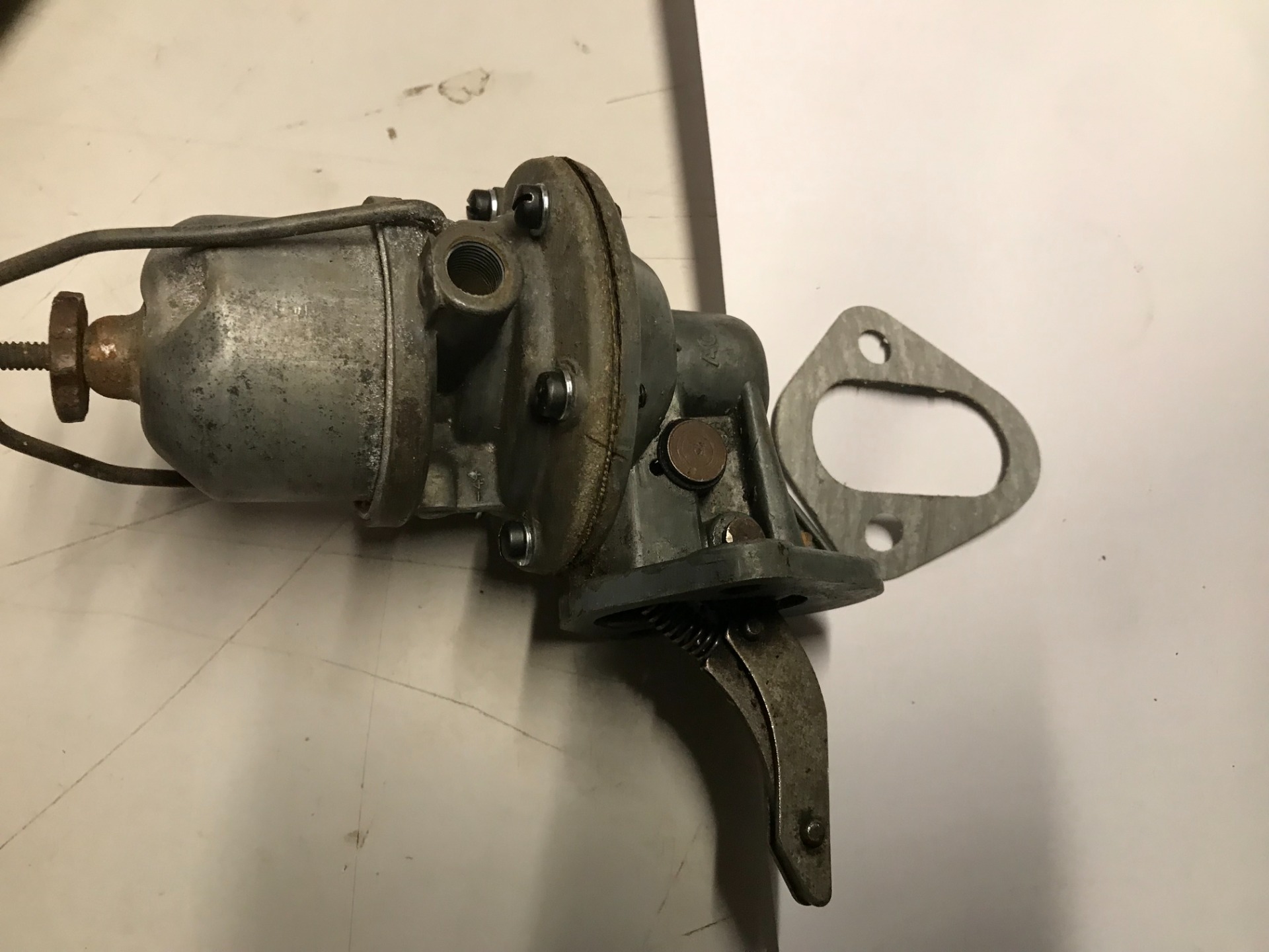 Willys Mod. Orginal Overhalt Bensinpumpe Uten/ Handtak for bensin pumping manuelt. Fuel Pump with Glass Bowl. M/ pakning til motor. Messing Koblinger må bestilles separat. Bilde er illustrasjons Bilde A8323 (NB! uten nyere vakuum underdel)